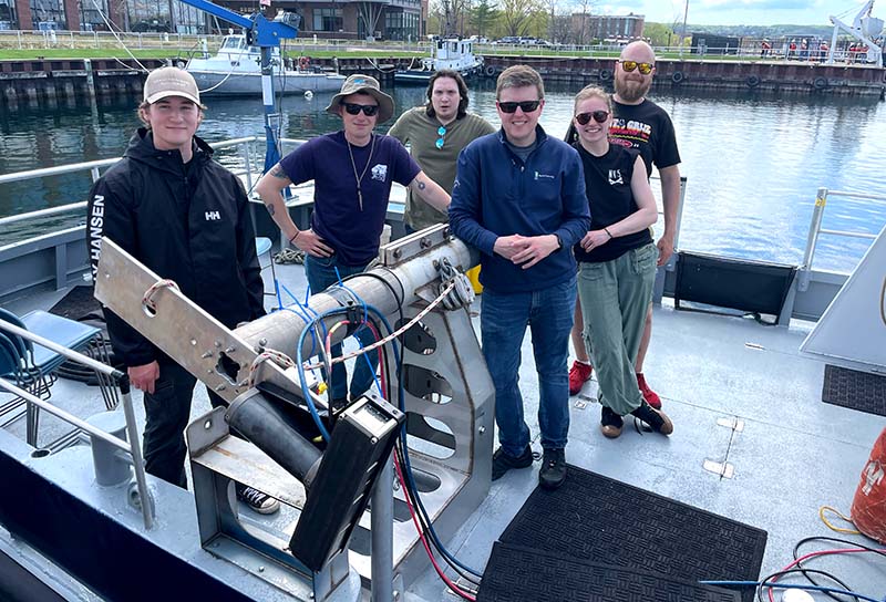 T50-R multibeam sonar system. Geoff Crews, Teledyne’s application engineer, traveled to Traverse City to help students integrate the system aboard NMC’s 56-foot research vessel, the Northwestern. Using a customized over-the-side pole mount, the team set up the